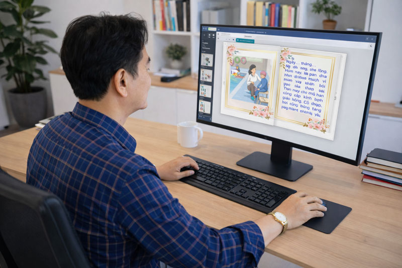 Sử dụng giọng đọc chuẩn bằng giọng đọc Vber: Một cuốn sách đẹp mà thiếu giọng đọc chuẩn thì cũng giống như một bức tranh thiếu đi màu sắc chủ đạo. Tôi tìm đến Vber để chuyển đổi văn bản đã chuẩn bị thành giọng nói. Tôi luôn khắt khe trong việc chọn giọng đọc: phải là giọng miền Bắc hoặc miền Nam chuẩn, ngữ điệu phải ấm áp, truyền cảm và đặc biệt là phải phù hợp với lứa tuổi tiểu học. Một mẹo nhỏ mà tôi luôn áp dụng là điều chỉnh tốc độ đọc chậm lại một chút (khoảng 0.9x) để học sinh lớp 3 có thể dễ dàng dùng ngón tay dò theo từng chữ. Khi tiếng đọc mẫu chuẩn âm vang lên, các em sẽ có một khuôn mẫu hoàn hảo để bắt chước và rèn luyện.